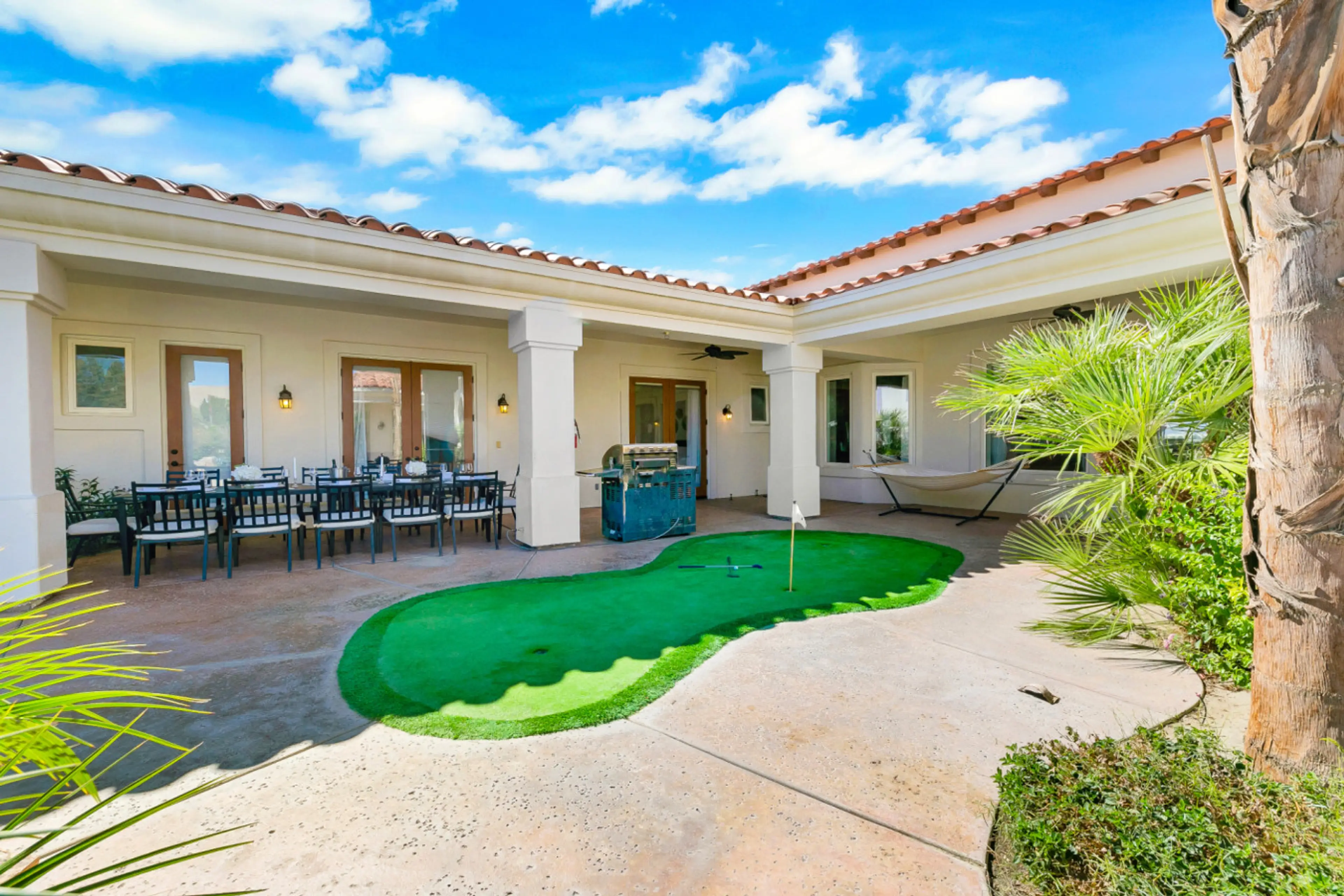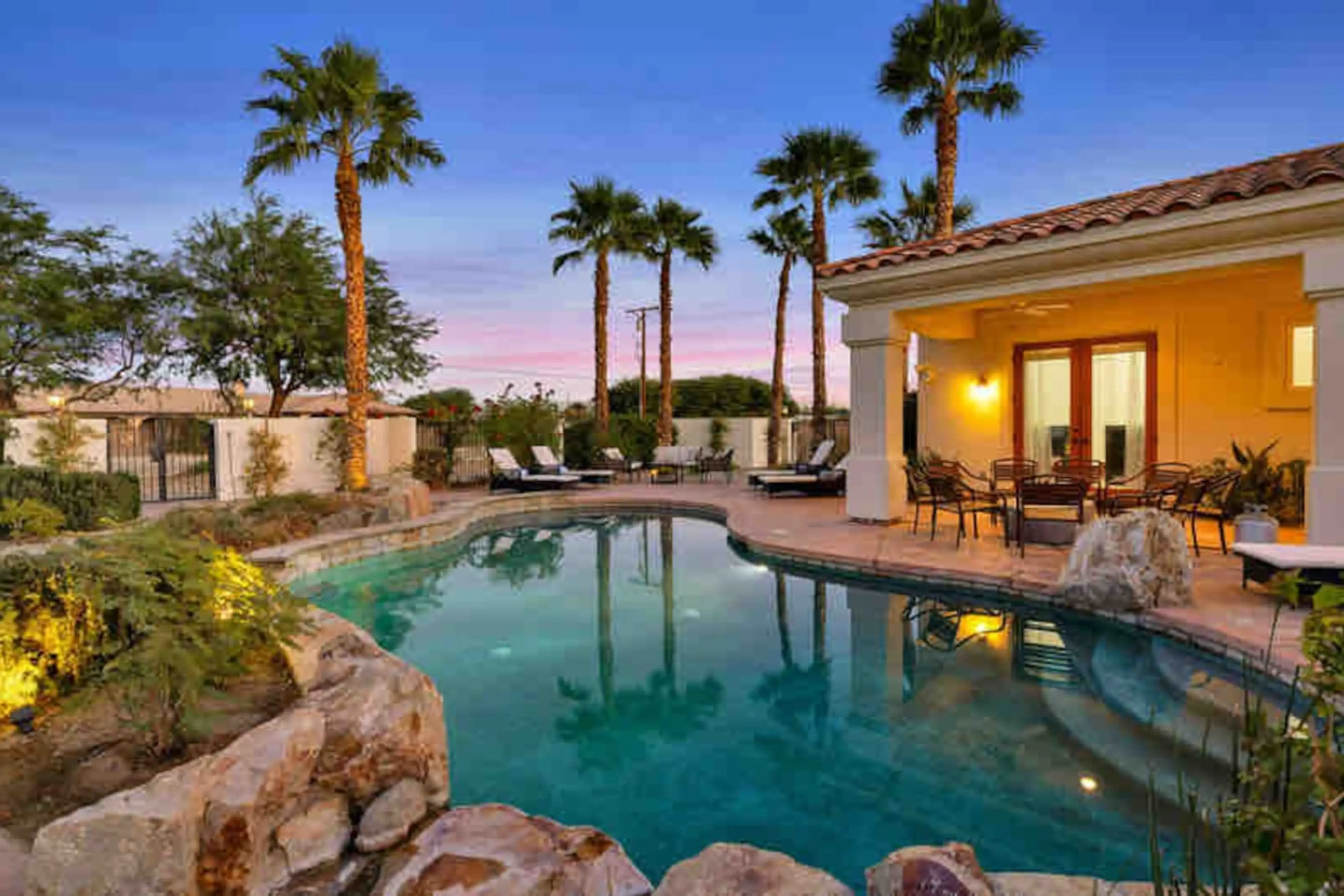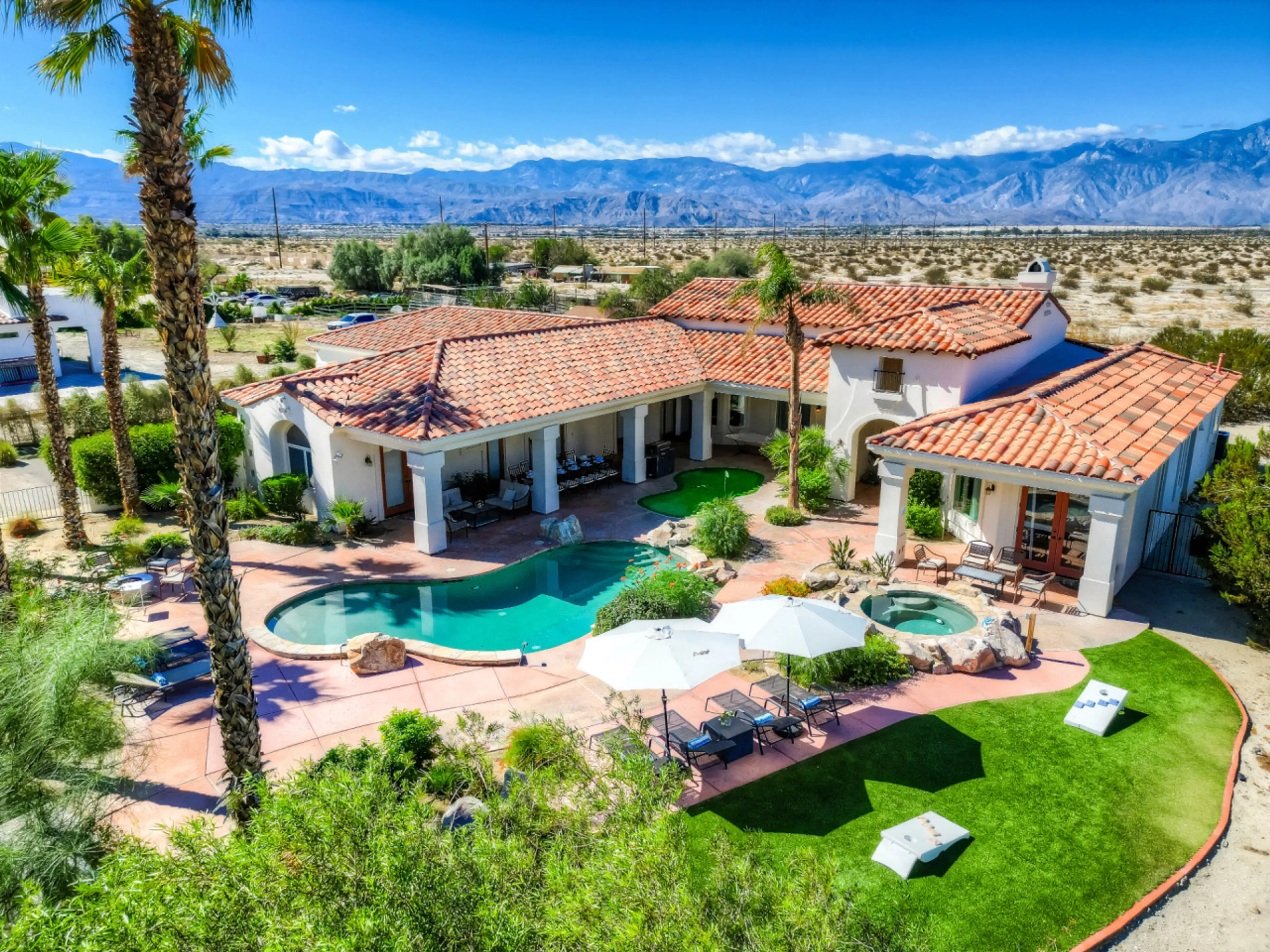 1000 Palms Estate is highly upgraded & entertains 12 guests! The wrap around patios lead you to a beautiful desert oasis with palm trees & a fenced pool + spa. You'll find plenty of fun with the indoor & outdoor games! The Great Room is open concept includes a floor to ceiling stone fireplace & a go...